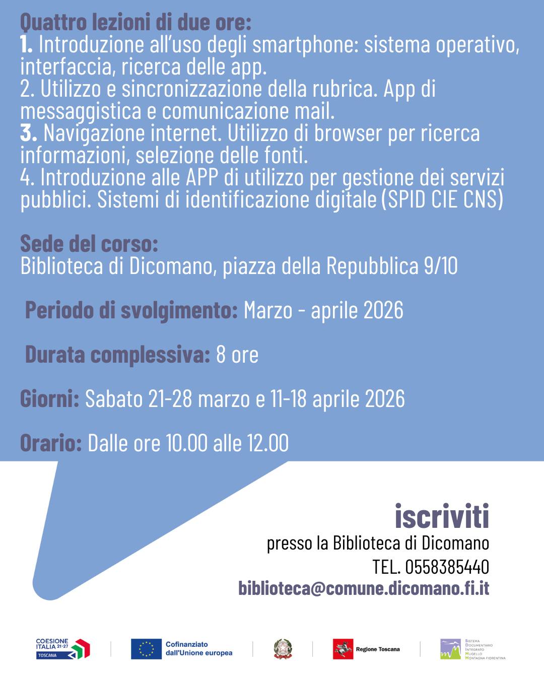 Il corso è destinato a tutti coloro che si trovano in difficoltà nell’utilizzo dello smartphone, perché mancanti di una formazione minima sulle tecnologie software e informatiche. Il corso è finalizzato all’acquisizione di competenze per l’utilizzo di strumenti di comunicazione (mail, messaggistica), per la ricerca di informazioni e per l’utilizzo di applicazioni di uso comune nella vita quotidiana, al fine di migliorare l’efficienza personale e professionale.
