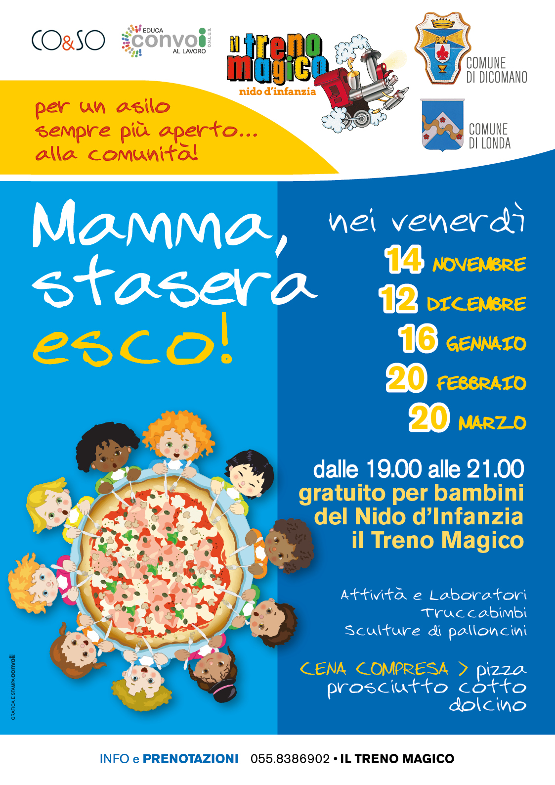 Anche per quest'anno l'Asilo nido il Treno magico organizza cinque incontri di mamma stasera esco nelle seguenti date: 14 novembre, 12 dicembre, 16 gennaio, 20 febbraio, 20 marzo dalle ore 19 alle ore 21.